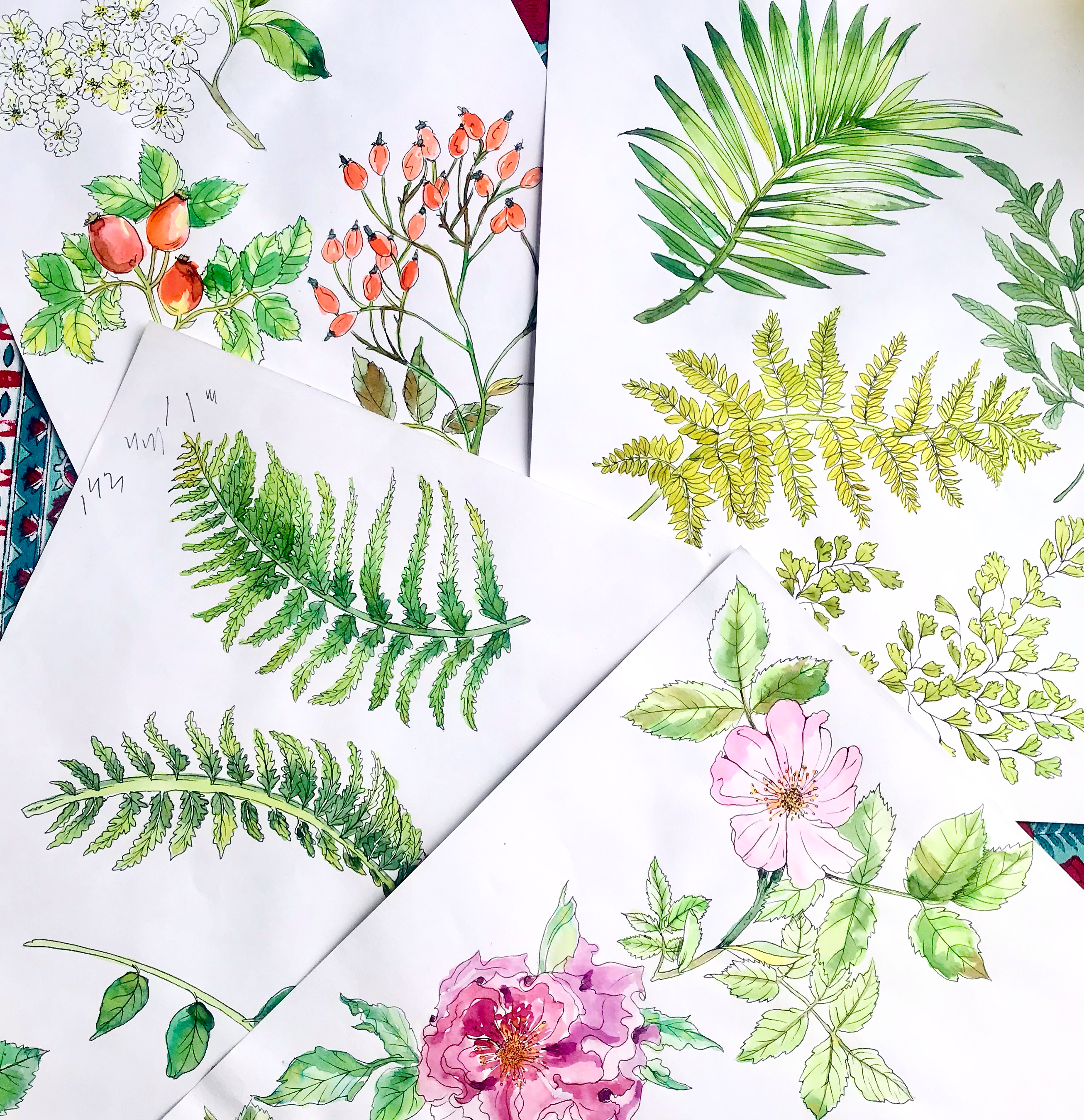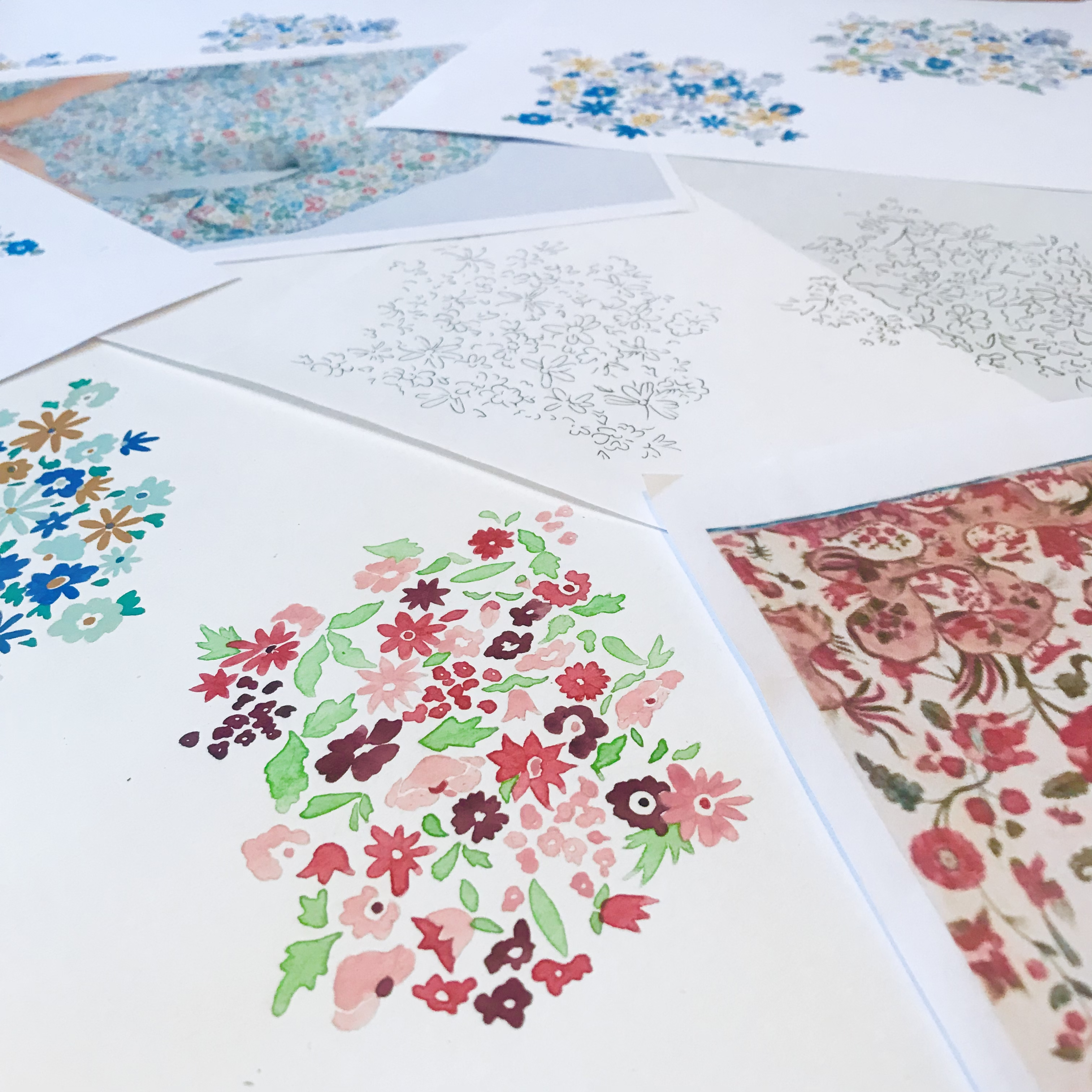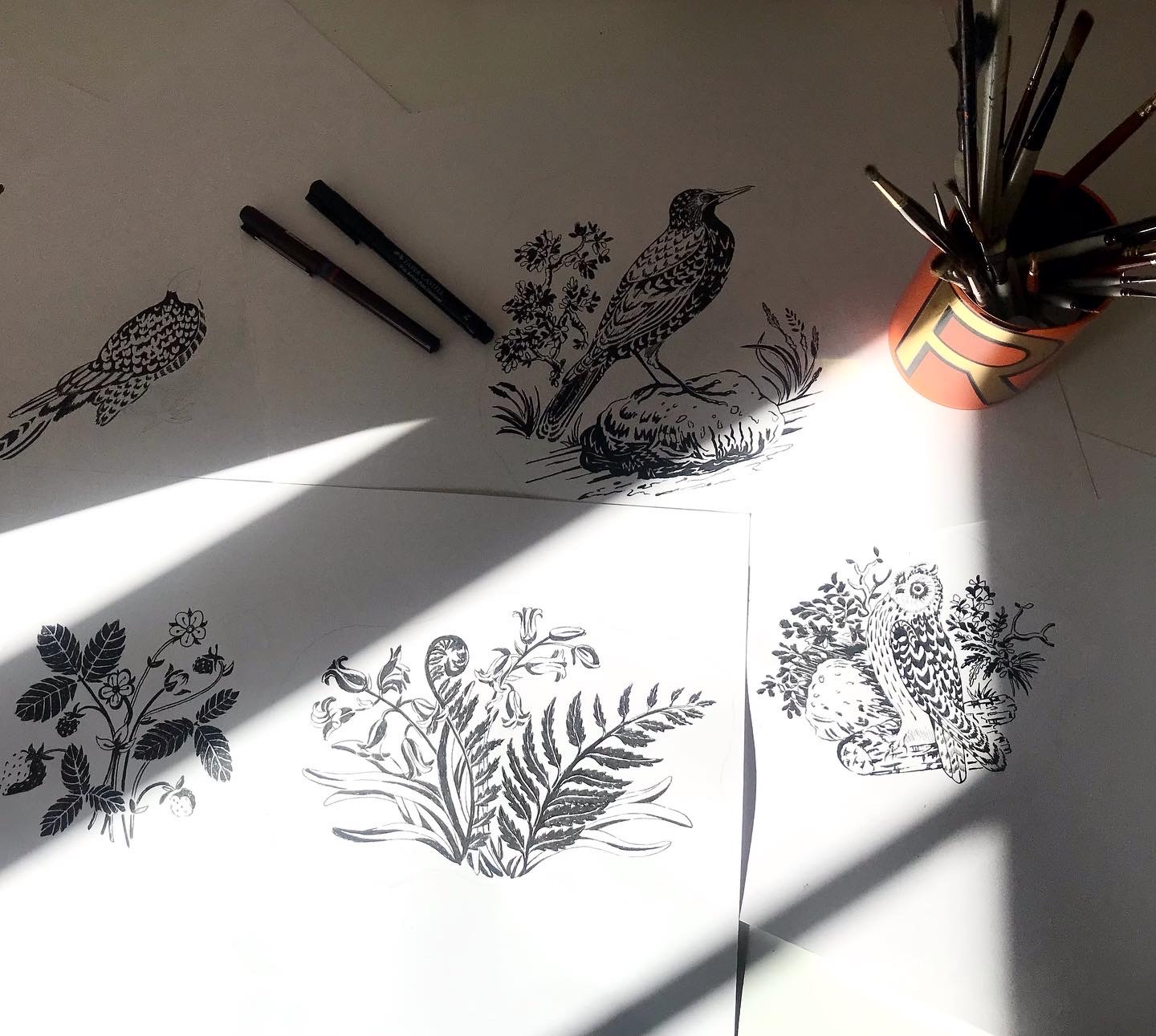 Rosanna creates original paintings and drawings by hand, experimenting with mediums such as gouache, collage, linocut, coloured pencil, watercolour, sunography and Indian ink. She then scans artwork into the computer in order to digitise and refine the drawing, before working it into a repeat tile and creating colourway options.