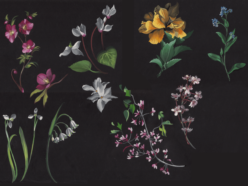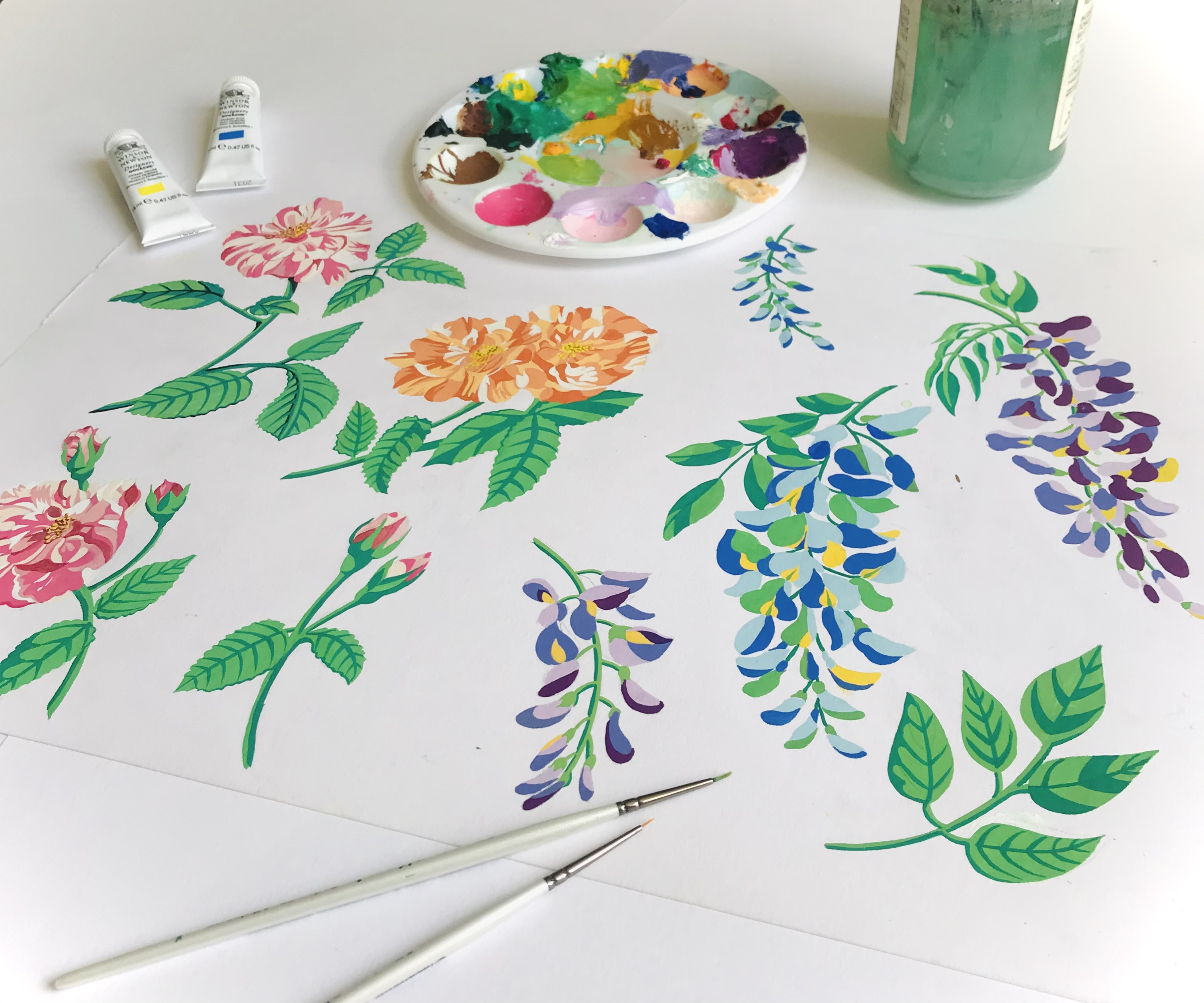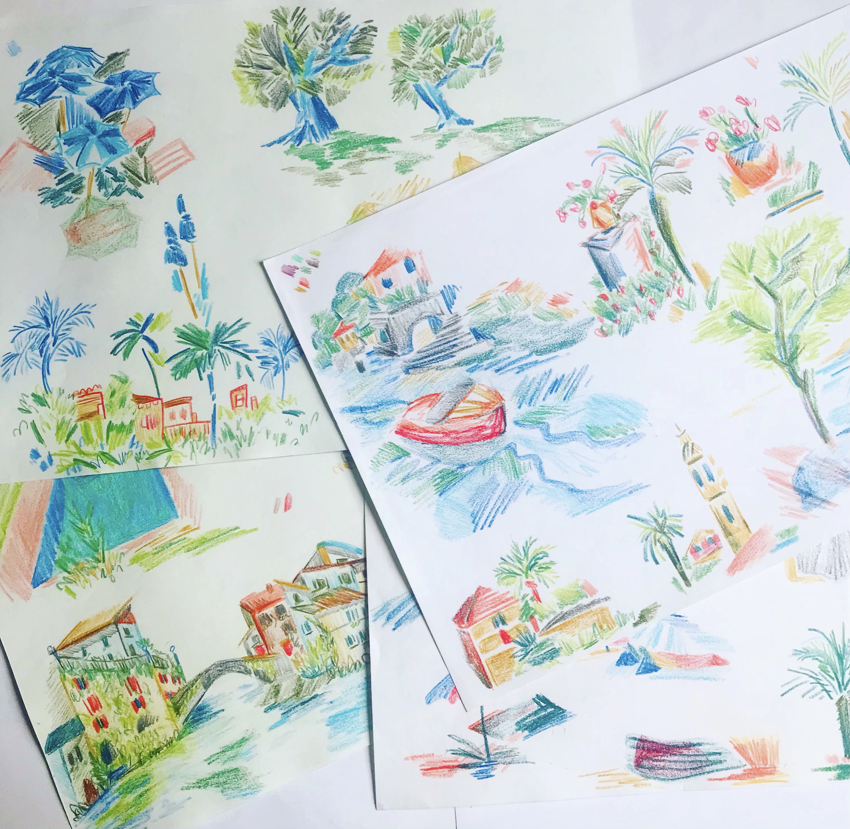 Rosanna creates original paintings and drawings by hand, experimenting with mediums such as gouache, collage, linocut, coloured pencil, watercolour, sunography and Indian ink. She then scans artwork into the computer in order to digitise and refine the drawing, before working it into a repeat tile and creating colourway options.